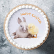 Dieses süße Tortenfoto zeigt den Osterhasen und das Küken so süß kuscheln. 😍 Den Schriftzug "Happy Easter" im Shabby-Stil kannst du gerne personalisieren. 💬